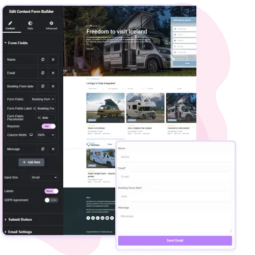 The Contact Form Builder Widget in WpRentals helps you create professional, flexible forms directly inside Elementor.