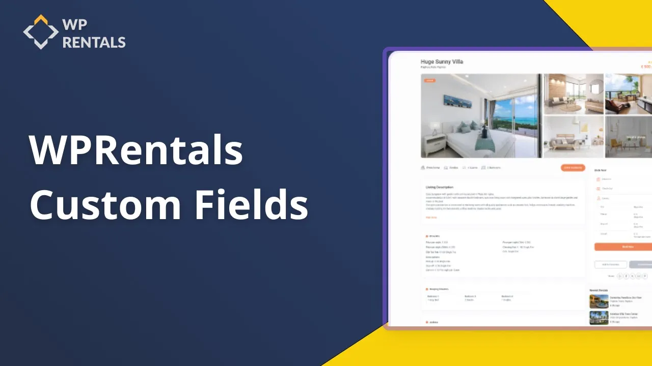 WpRentals gives you the power to add custom fields for each property so you can display the details that matter most. You can create fields like “Late Check-in”, “Private Entrance”, or “Family Friendly” using dropdown, number, date or short text types.